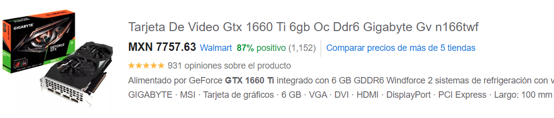 El siguiente componente y el más importante, la tarjeta gráfica, Aquí podemos elegir la que queramos según los componentes que tienes y qué es lo que quieres que haga tu PC. Es muy importante los GB que tiene la gráfica, eso determina si es buena o no, de 4GB en adelante es pasable, si la capacidad es menos, la tarjeta será más barata y con un rendimiendo que no todos estaríamos muy contentos. Si quieres que tu pc vaya a Full HD (1920x1080p) a unos aceptables 100 fps en la mayoría de los juegos, Mi recomendación sería laGTX 1660 Ti